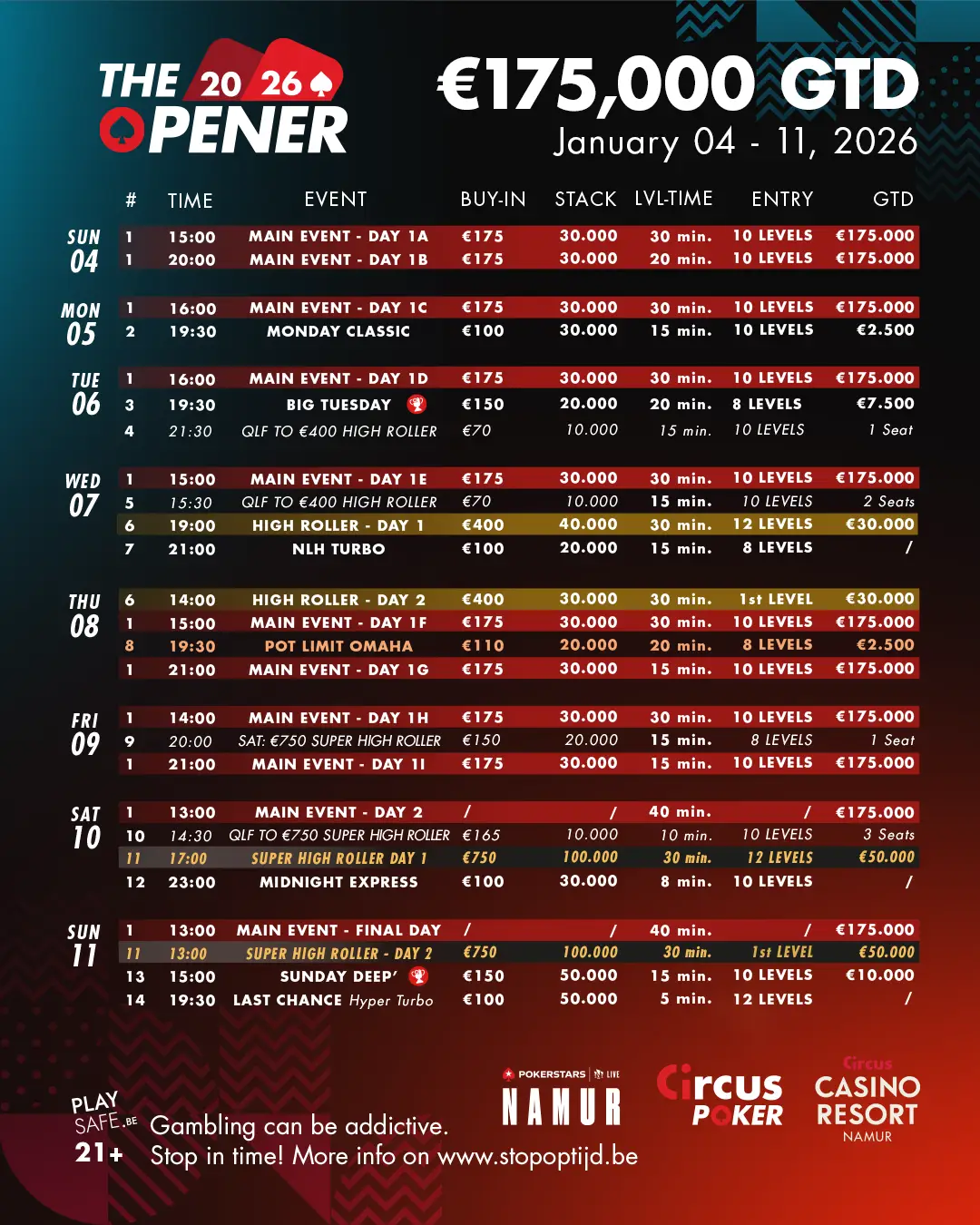 The period from May to June represents the peak of the poker season in Belgium. The country’s largest national festivals are traditionally held during this time, with highly attended Main Events and significant media exposure.